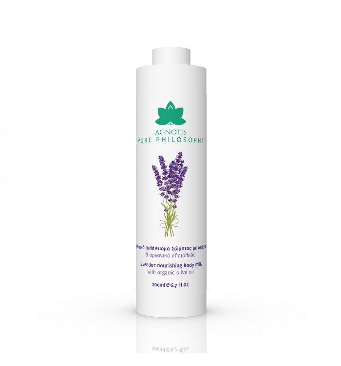 Θρεπτικό γαλάκτωμα σώματος για την καθημερινή φροντίδα του δέρματος. Περιέχει πλούσια σύνθεση σε ευεργετικά έλαια και βιταμίνες, προσφέρει αίσθηση ευεξίας, τρέφει σε βάθος και αναζωογονεί την επιδερμίδα. Περιέχει βιολογικό έλαιο ελιάς και εκχύλισμα λεβάντας που καταπραΰνει το ευαίσθητο δέρμα, ενυδατώνει βαθιά το δέρμα και αφήνει ένα απαλό, βελούδινο πέπλο ευωδίας.